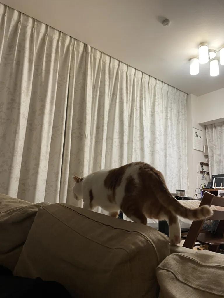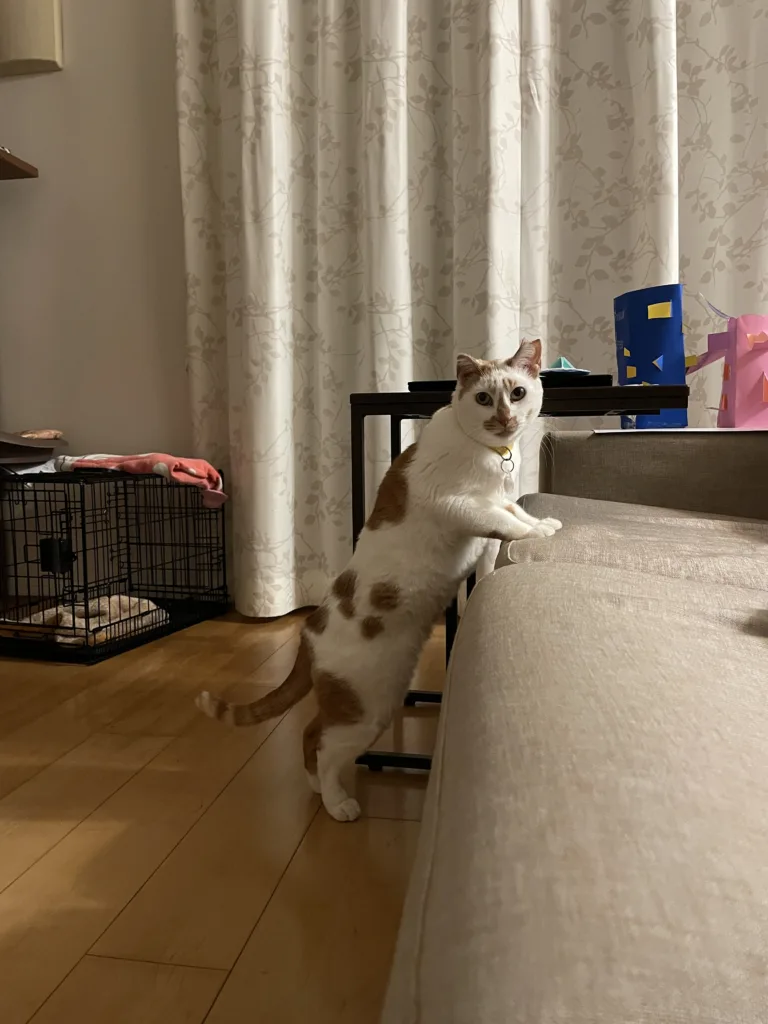 不安だったり疲れた反動でそうなっているのかなぁと思い、きなこがいるリビングのソファで寝てあげることにしました。そうすると、このようにソファの周りをうろうろ。
