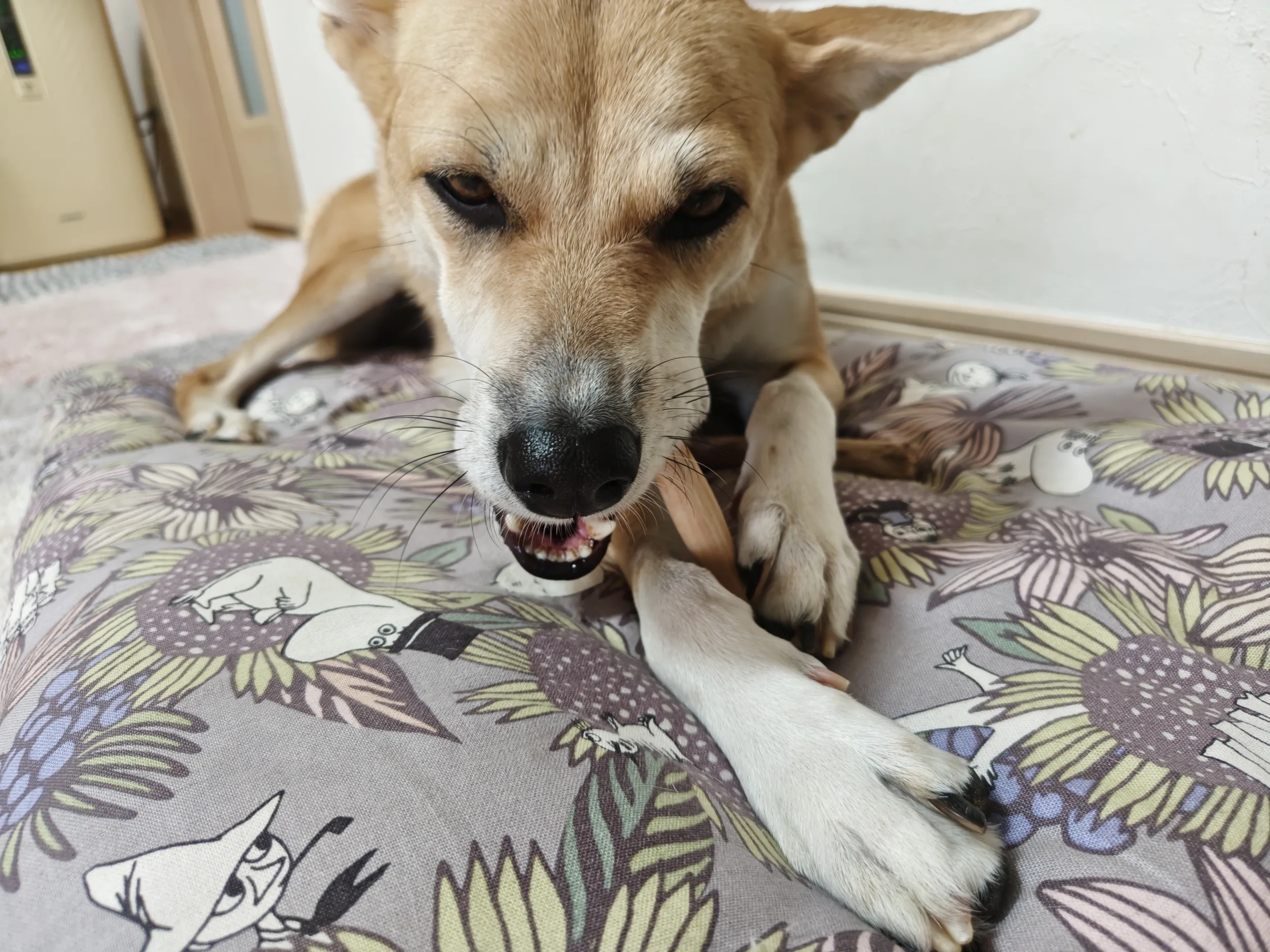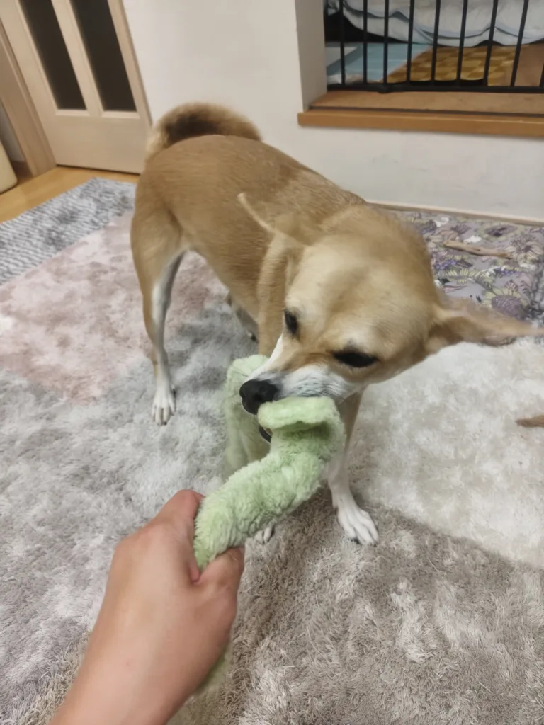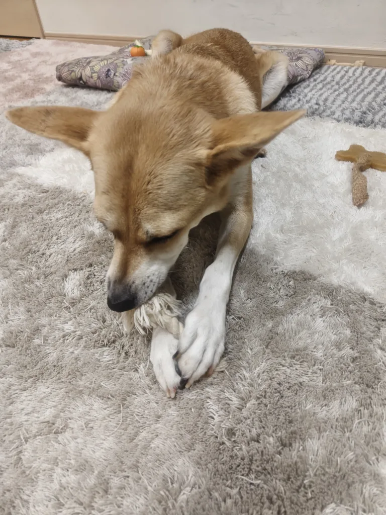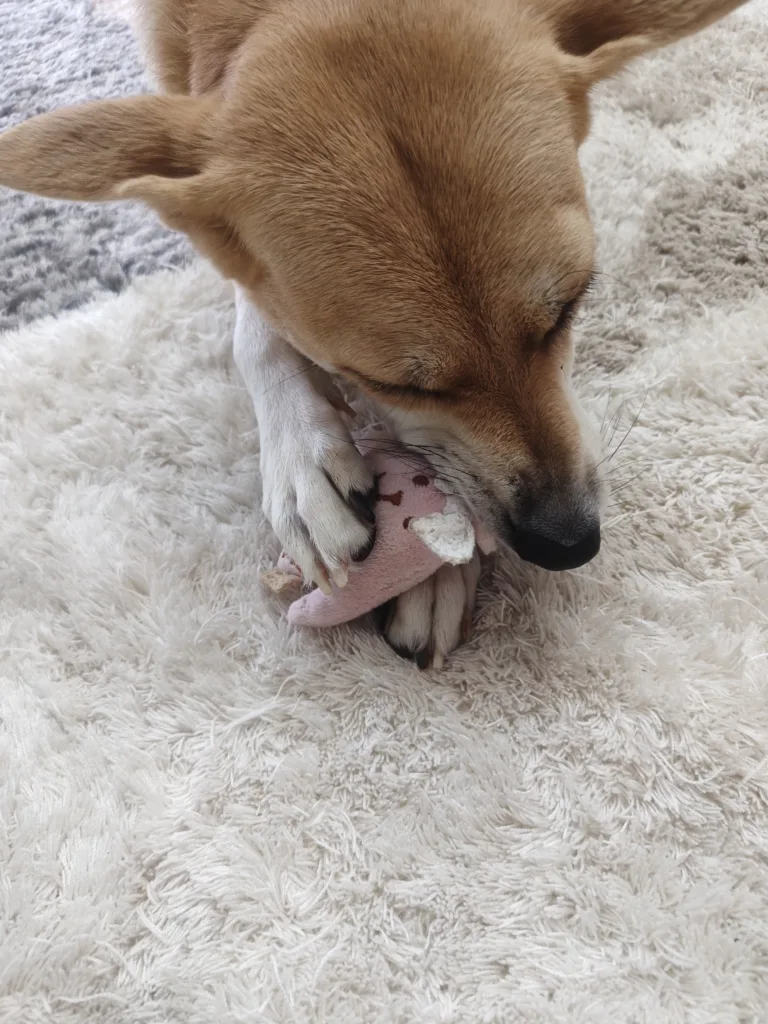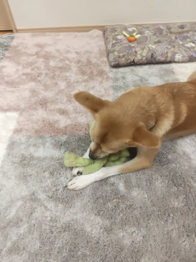 ただ、私が声を出すと中断してなでなでを催促🤭そして、珍しい事にたいていのワンコが好きなおもちゃの音が苦手みたい。ピーピーなるボールも苦手。