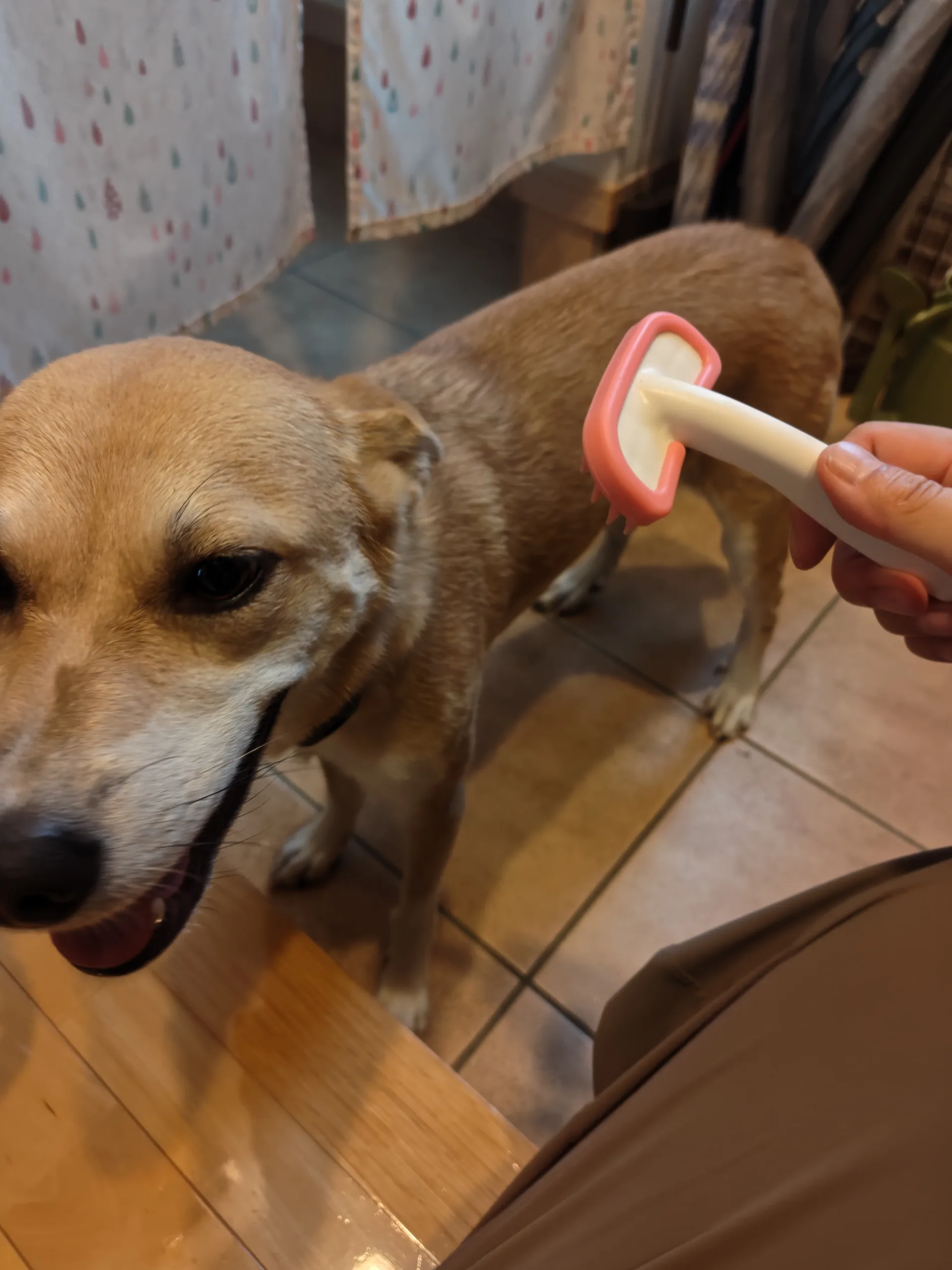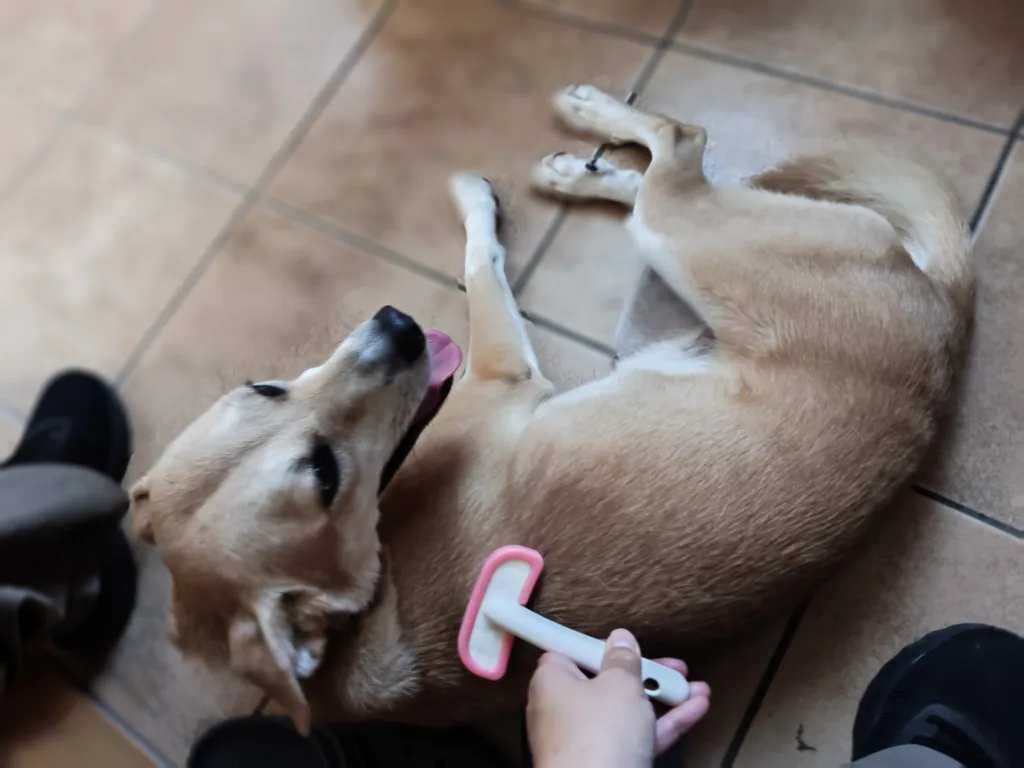 【エンジェル@グルーミング好き🩷】 2025.10.05 エンジェルちゃん、お散歩後のグルーミングも上手にさせてくれます。どんなブラシでもオッケー👏 最初の頃は帰ってきたらダダダーーッと部屋に上がりこもうとしてたけど、最近はちゃんと上に上がらず玄関で待機してくれます🎊 250925071911062 ただ、↑こうなっちゃう事が多いんです(笑)いいんだけど、だいたい左下でゴロンするから左側ができないという😂