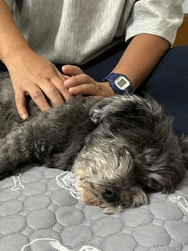 そういえば先日、いつものマッサージデーでした!施術は、定期的に来てゴッドハンドで至福の時間を提供してくださるスウェーデン式ドッグマッサージのセラピスト・UMICOさん!