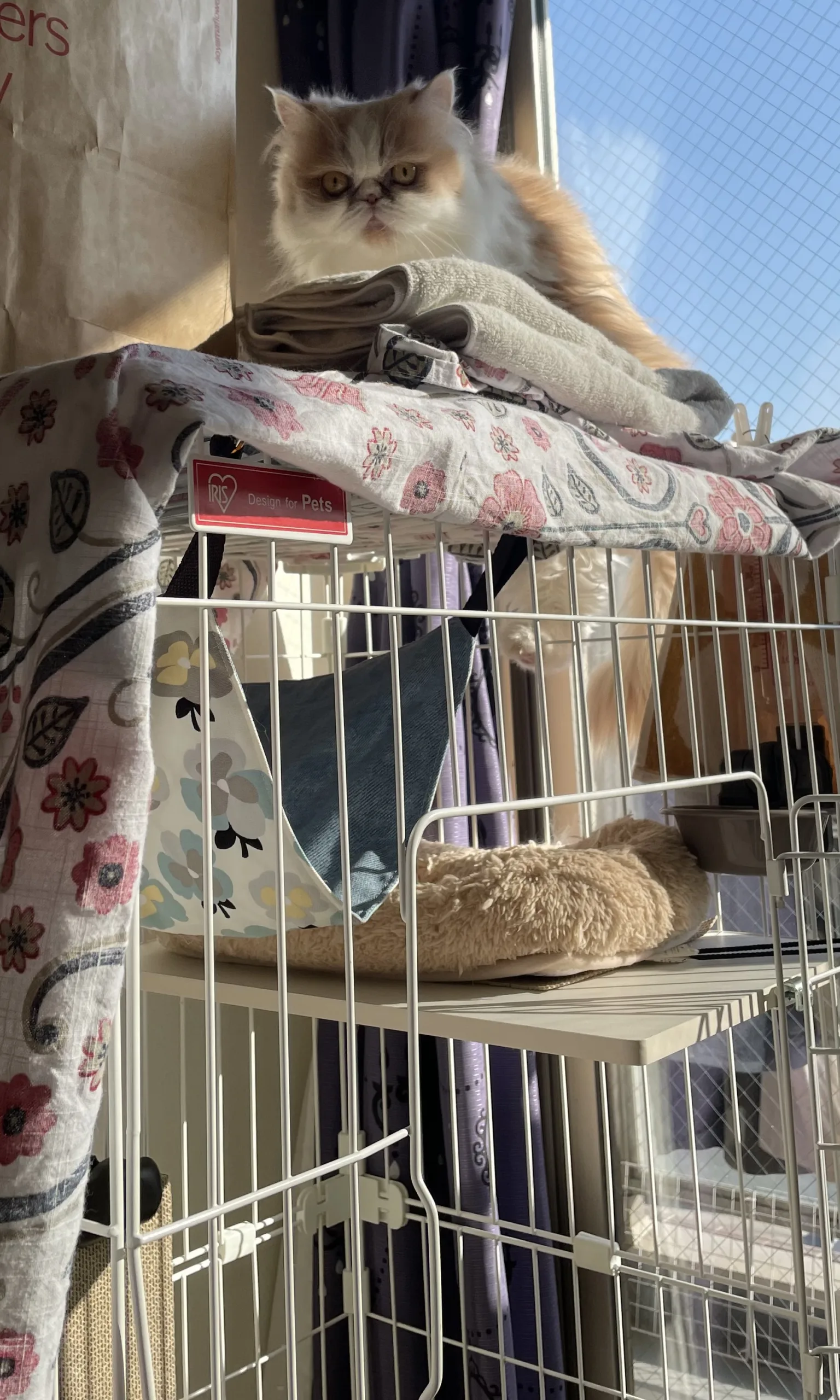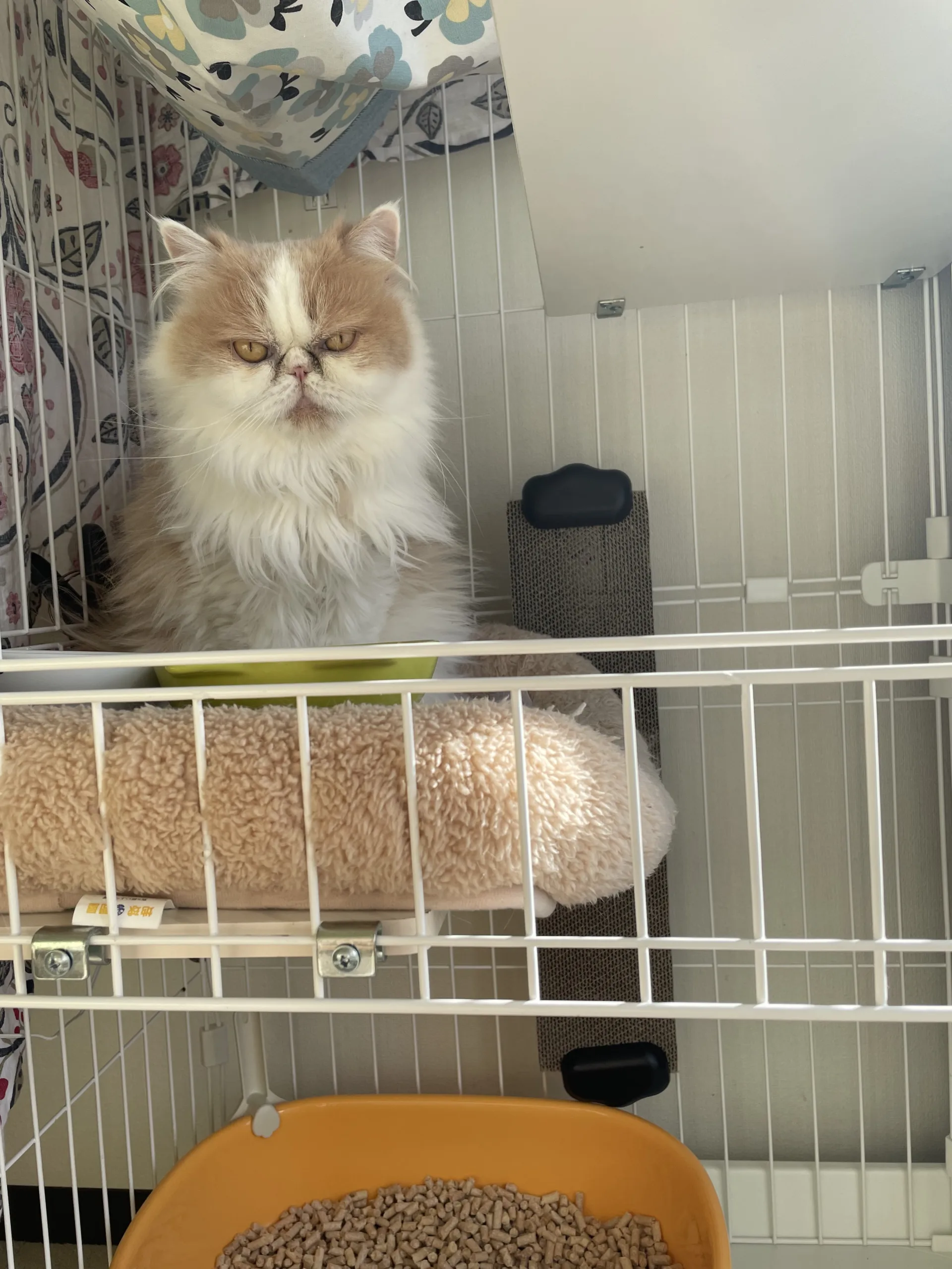 「大人しくケージの中で過ごしている」と聞いていました。ケージの中にいることが多いですがときどき外に出て過ごし、聞いていたとおり大人しいコでした。ところがこの間ふと部屋を覗いてみたところネイリッカの姿が見えません! 辺りを見回してもいない!! 外に出たのか?と窓の外を見ようとしたらなんとケージの上におりました。ケージのフェンスをよじのぼったようです。(あせった💦) ネイリッカは大人しくやんちゃな女子だと判明しました。。。 そして現在イヤイヤ期のようでシャー連発中。ネイリッカ、女子同士仲良くしませんか?