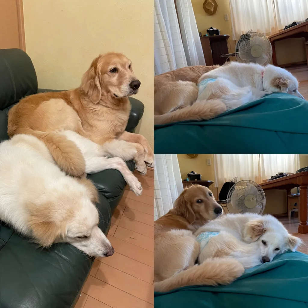 1月前にはうちの犬が少し怖くて、関わりたくない触りたくないという風だったのが、今では、こんな風にくっついても気にしないようになりました。お散歩でも、、、