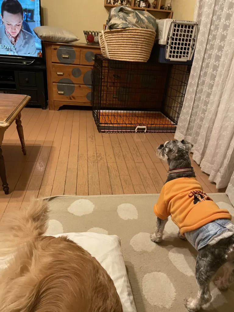 「預かりおばちゃんより補足」これは初めてテレビに遭遇した日の様子。テレビをつけた瞬間は跳んで走って逃げましたが、すぐに戻ってきて、ジーッと観察。それはもうジーーーーッと、1時間くらい立ち尽くして観察し、その後そろそろと近寄って観察。危ないことはなさそうだと判断したようです。1週間ほどでテレビから大きな音がしても全く気にせず寝ていられるようになりました。