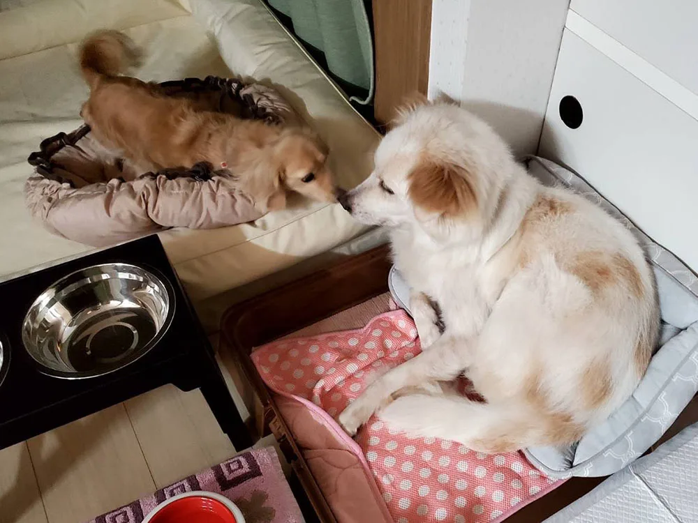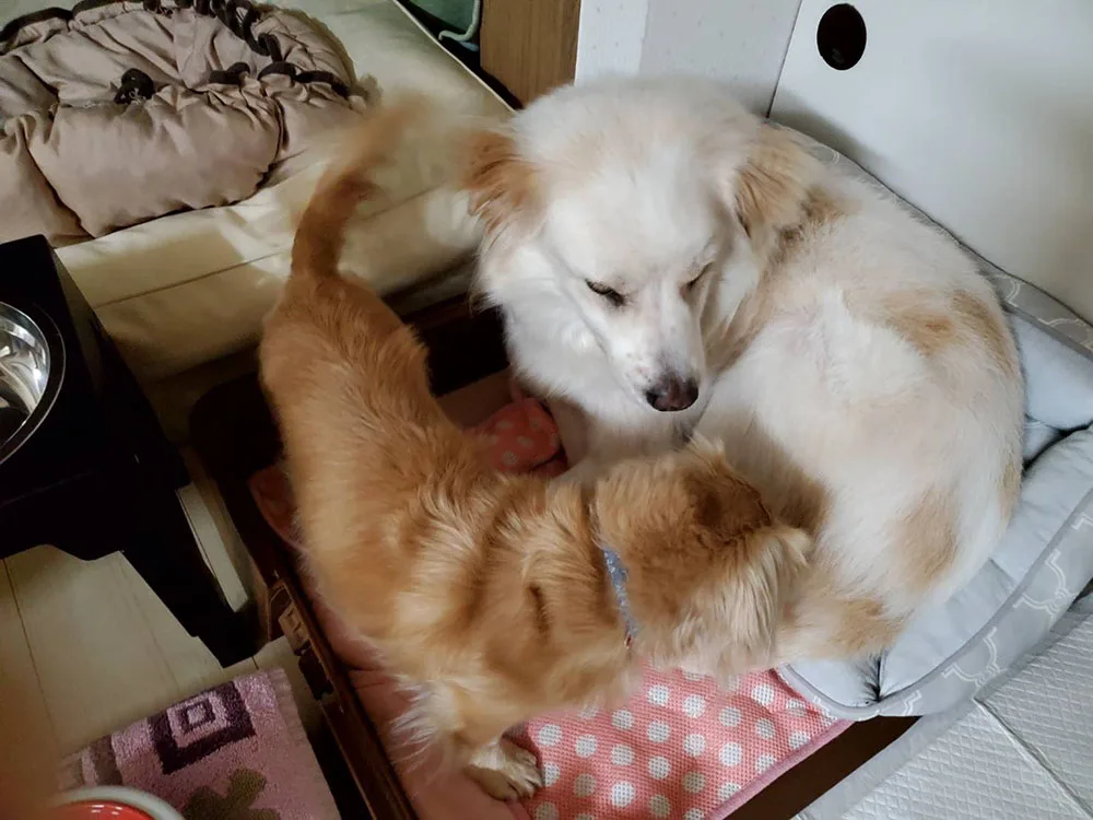 先住犬さんも、とく君を熱烈歓迎してくれたみたい。最初のうちは、おっとりなとく君が引いちゃうくらいだったそうですが(苦笑)、とく君も徐々に慣れたみたいで、今では2匹で仲良く過ごせているようです。