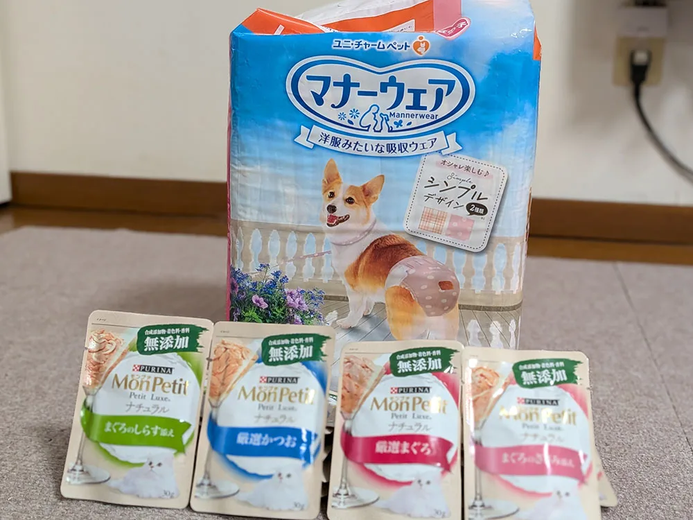 ふきすもも様より、Amazonのほしい物リストから「モンプチ プチリュクス ナチュラル 無添加 厳選まぐろ・厳選かつお・まぐろのささみ添え・まぐろのしらす添え 30g 各6袋【計24袋】」「犬用 おむつ 女の子用 Lサイズ 中型犬用」をご寄贈いただきました。