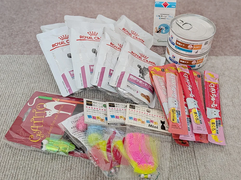 横浜市のT.M.様より猫用腎臓療法食、おもちゃ、サプリメントをご寄贈いただきました 2026.01.31 横浜市のT.M.様より猫用フード、おもちゃ、サプリメントをご寄贈いただきました。 最近、保護した猫のたけるが慢性腎不全のステージ3と診断されており、特に療法食のご寄贈は助かります! T.M.様、あたたかなお心づかいをいただき、本当にありがとうございました。