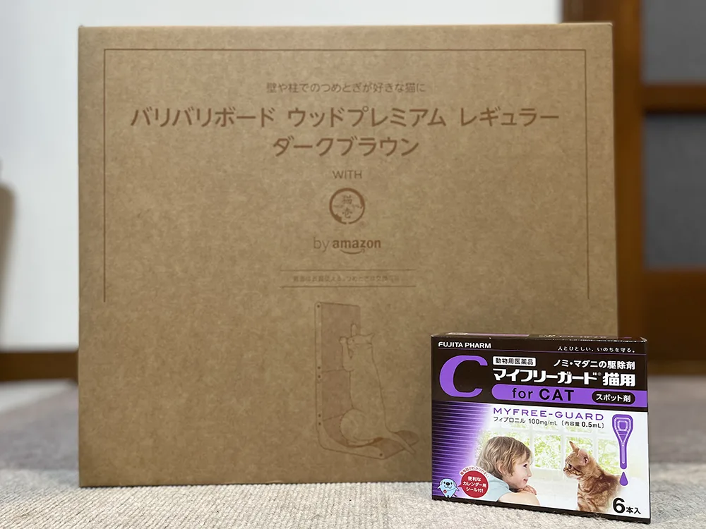 鎌倉市のE.Y.様より、Amazonのほしい物リストから「by Amazon 猫壱 爪とぎ バリバリボード ウッドプレミアム」、猫用ノミダニ薬「マイフリーガード」をご寄贈いただきました。
