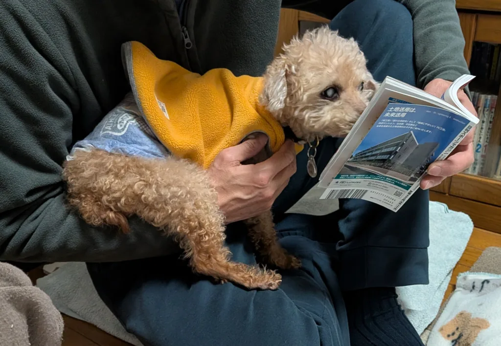 幸太郎くん、大好きなお膝の上で 真剣に見ているのは 「2026 プロ野球選手名鑑」!!