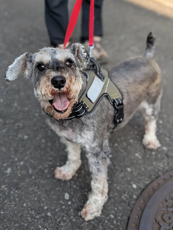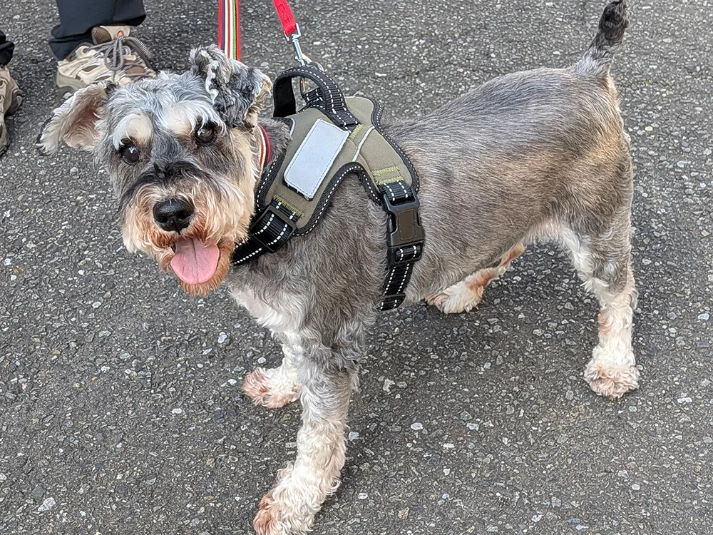名前は「とんとん」。ミニチュアシュナウザーらしい、明るく賢く人懐っこく、好奇心旺盛で活発な男のコです。が、長くブリーダーの元で暮らしていたせいか、一般的な家庭生活に不慣れな面も。